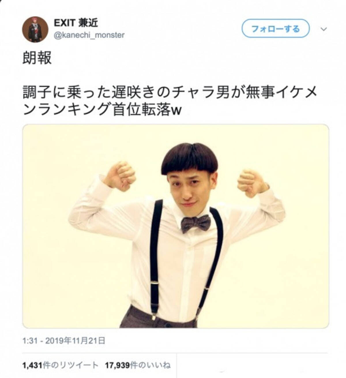 Exit兼近 お坊ちゃん 姿で原点回帰 無事イケメンランキング首位